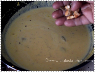 9. Add the crushed cardamom and the fried cashews and raisins. Give a stir. Check whether the kheer came to a little thick consistency as shown below.