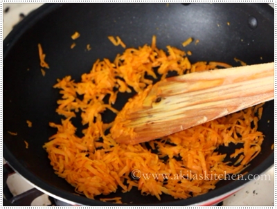 4. In the same pan, add 1 tsp ghee and add the grated carrots and fry it till the shhh sound stops (around after 4 to 5 min.)