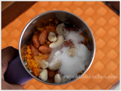6. Transfer the content to the mixer, along with the soaked almonds, cashews and sugar. Grind to a smooth paste. (Add 2 to 3 tsp milk if needed)