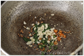 4. In a kadai add oil and throw in the mustard seeds, urad dal, channa dal, chilies and the curry leaves.