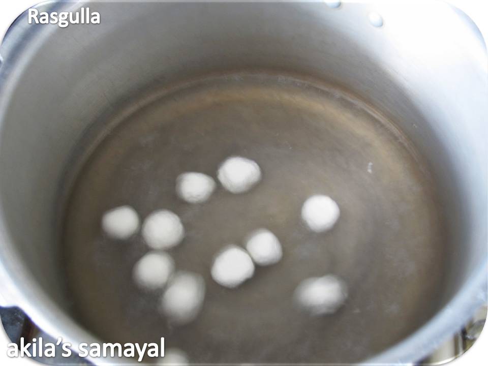 [Note: Since i planned to make rasmalai also with these rasgulla’s, i made two sugar syrup as i dont want the rasgulla’s to be too sweet for rasmalai. So you can use the sugar syrup that is used to pressure cook the rasgulla’s by adding one more cup of sugar to it. Then cool the rasgullas by refridgerating them and serve cool]