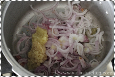 - Soak the rice for 20 min. In a pressure cooker, add oil and when it is hot, add the spices and fry for a min. Add the onion and fry till soft. Add the ginger garlic paste and sauté till the raw smell goes off.